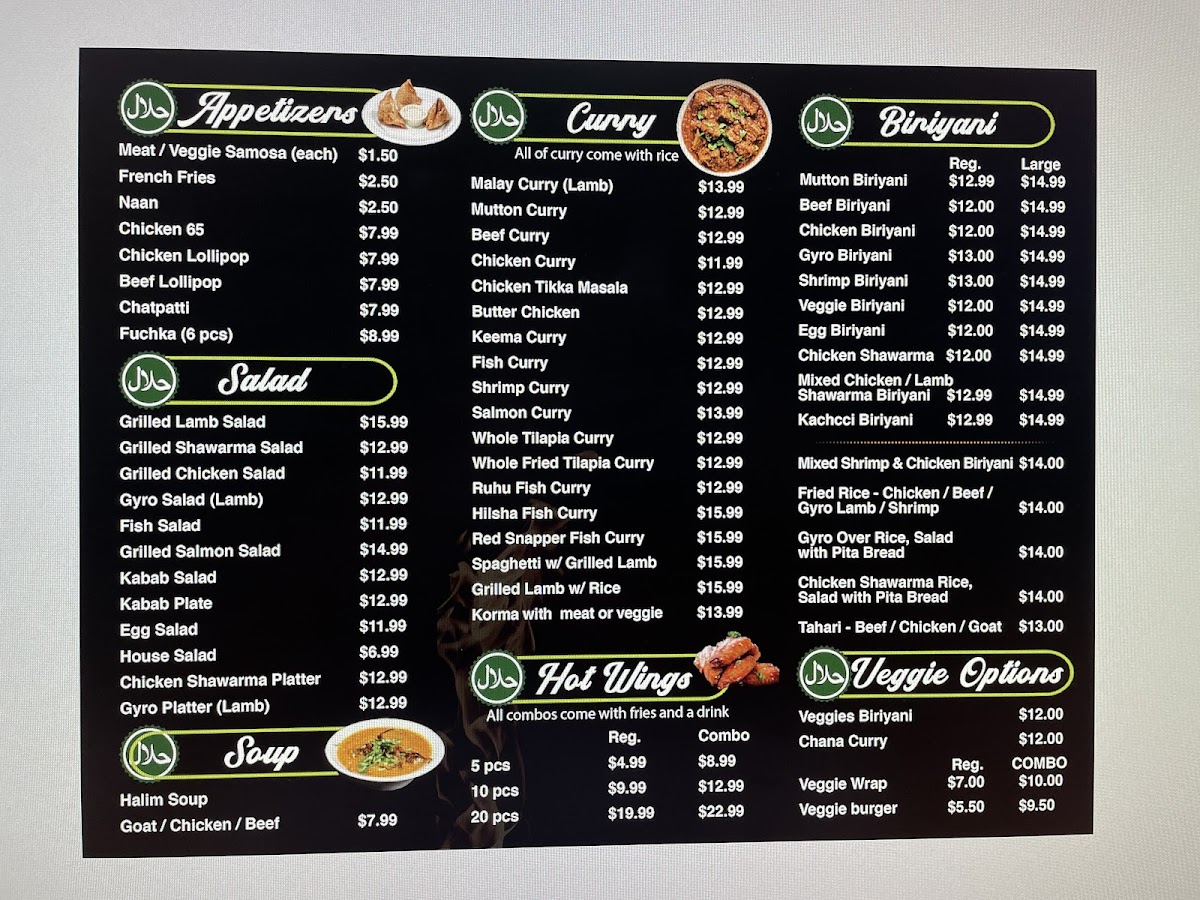 Biryani enthusiasts will find several options to satisfy their cravings, such as the Beef Biryani and Chicken Biryani, available in both regular and large sizes. For those looking for something extra, the Chicken Shawarma Biryani offers a fusion twist on the classic dish.